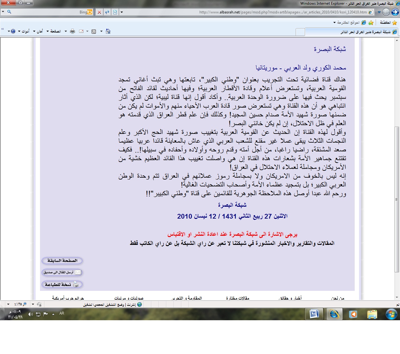 أعرب القيادي بحزب الصواب محمد الكوري ولد العربي في رسالة إلي شبكة "البصرة نت" العراقية عن انزعاجه من سلوك قناة ليبية تسمي "الوطن الكبير" لتجاهلها صور ومواقف الزعيم العراقي الراحل صدام حسين..