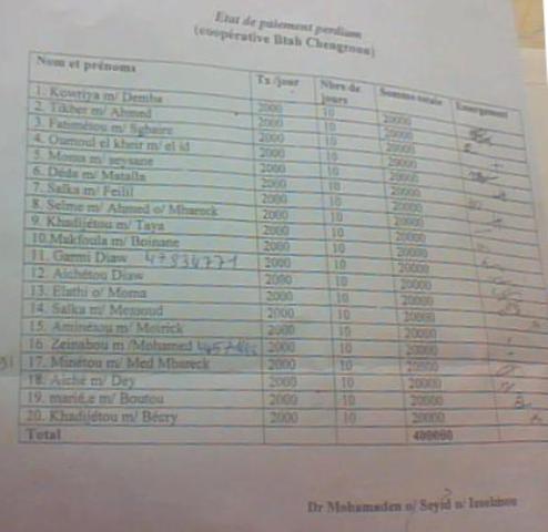 قال عدد من نساء تعاونية "ابطاح شنكورن" بمقاطعة أطار عاصمة ولاية آدرار إن المدير الجهوي للتنمية الريفية بالولاية محمدن ولدسيدن ولد شنكرون قد استحوذ على مبلغ ثلاثمائة ألف أوقية من مخصصاتهن المستحقة نتيجة مشاركتهن في دورة تكوينية.