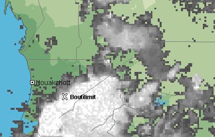 وحسب آخر صور الأقمار الاصطناعية فقد شهدت المنطقة الواقعة أفقيا بين مدينة تنبدغة فى الحوض الشرقي ومدينة بوغى فى ولاية لبراكنة، شهدت هذه المنطقة منذ غروب الشمس وحتى الآن وجود سحب خفيفة على الحوضين وكثيفة على غرب لعصابة، وكامل غيدى ماغة، غورغل وجنوب لبراكنة ويتوقع أن تكون المنطقة شهدت أو تشهد الآن تساقطات مطرية مابين 5 إلى 60 مم بإذن الله تعالى.