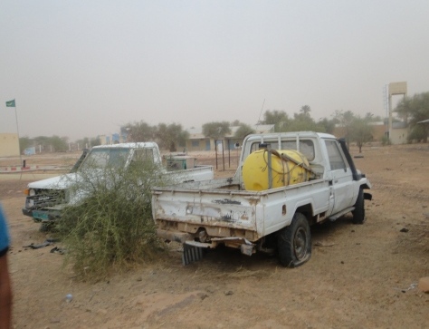 إحدى المركبات المتعطلة في القاعدة ويبدو بوضوح شعار منظمة OCLALAV التي كانت مسؤولة عن محاربة الجراد في المنطقة وخلفت نفايات في مناطق من غرب إفريقيا من بينها "لتفتار" وسط موريتانيا (الأخبار)