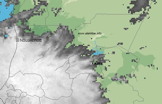 تظهر آخر صور الاقمار الاصطناعية أن السحب الكثيفة التى كانت تعم جل الولايات الشرقية والجنوبية بدأت تنقشع على وسط البلاد وأنها تتجه الآن نحو الجنوب الغربي، لكنها مازالت كثيفة وممطرة على كامل غيدى ماغة، غورغل، جنوب لبراكنة وكامل النصف الجنوب من ولاية ترارزة، ولايتوقع أن تنقشع عن حوض النهر قبل الرابعة أو حتى الخامسة من عصر اليوم بإذن الله تعالى، لكن يتوقع أن تخف الأمطار كثيرا، إن لم تتوقف كلية، ابتداء من الساعة الثالة من ظهيرة اليوم بإذن الله.