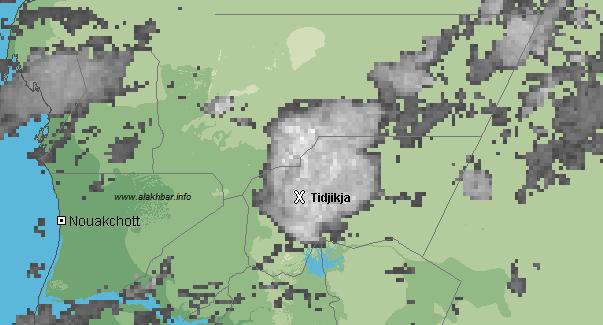 أما على الشمال فقد تواجدت سحب كثيفة على ولايتي داخلة نواذيبو وإينشيري ابتداء من الثامنة من مساء أمس، ويتوقع أن تكون أدت إلى هطول الأمطار طيلة مساء أمس وحتى فجر اليوم بإذن الله تعالى.