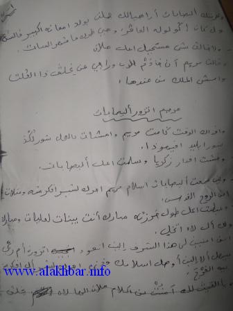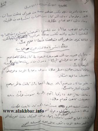 أوراق من مخطوط لترجمة الإنجيل إلى الحسانية بخط "البان" مدير معهد إسلامي بكيهيدي وتحكي الترجمة قصة زيارة مريم (عليها السلام) إلى المرأة العابدة "أَلِيصَابَات" والمولود الذي سترزقه الأخيرة في كبرها حسب الرواية الإنجيلية (الأخبار)