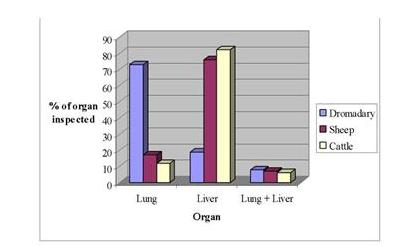 وحال الإبل يختلف عن حال البقر و الغنم فالنصيب الأكبر هو من نصيب الكبد بالنسبة للأخيرين حيث تتجاوز إصابة الكبد لدي البقر 82.3% فيما تبلغ في الغنم 76.1 % و بالتالي تبقى الرئة مستبعدة بشكل نسبي حيث لا تتجاوز نسبة إصابتها في البقر 12% بينما تبلغ في الغنم 17.3% فيما لا تتعدى إصابة كلا العضوين نسبة 5.7% و 6.5% .