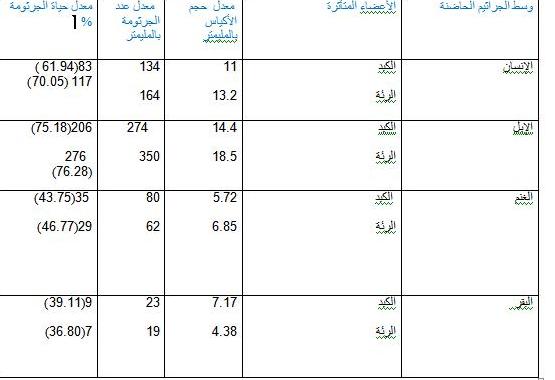 الخلاصة: الاختلاف بين معدلات الخصوبة عند الأكياس المائية والأعضاء التي سجلت فيها إصابات كبيرة في كل من الإنسان والإبل ( الرئة ) والأعضاء تكثر فيها إصابة الأغنام والأبقار ( الكبد ) يمكن أن يعتمد علي اختلاف أنواع الطفيليات المسببة للجرثومة.