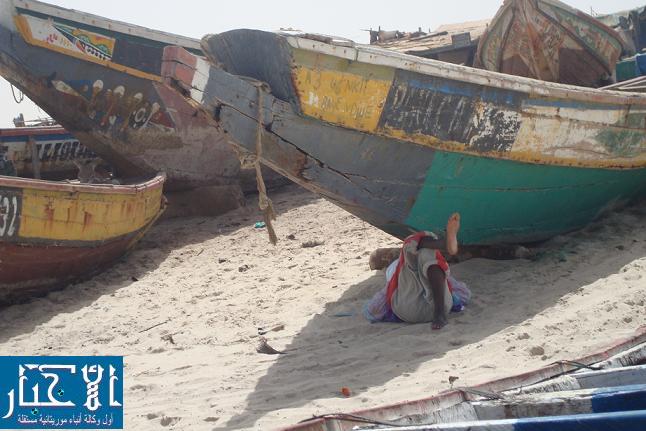 أمام سفينة رفيقه المتعطلة منذ أسابيع وتحت أشعة الشمس الحارقة أختار "أمادو" النوم بهدوء قبالة شاطئ الصياديين بالعاصمة نواكشوط في الساعات الأولى من صباح الثلاثاء دون أن يتناول وجبة الفطور أو يحظى بكاس من الشاي التقليدي كما يقول رفاقه في المأساة وهم يداعبون تراب البحر الهائج بفعل تقلبات المناخ.