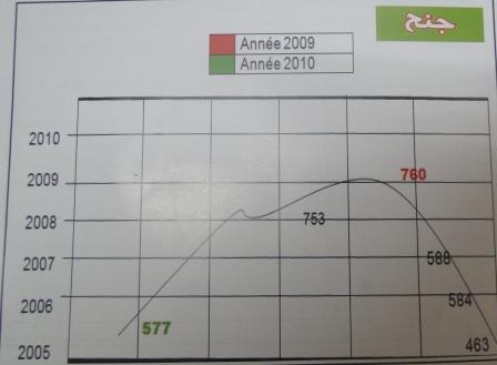 ويبرز استغلال البيانات المسجلة عام 2010 أن وحدات الدرك عام 2009 سجل حوادث بلغت 1152 ، لكن عدد الحوادث بلغ 715 فقط خلال عام 2010 وهو ما يمثل انخفاضا قدره 437 من الحوادث أي بنسبة 61% .وخلال نفس الفترة هبط عدد الحوادث التي تخلف أضرارا مادية من 459 إلي 278 أي بانخفاض 181 من الحوادث أو نسبة 65%. وانخفضت الإصابات التي وصلت 516 عام 2009 إلي 339 عام2010 متراجعة ب 177 أو نسبة 52%.