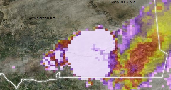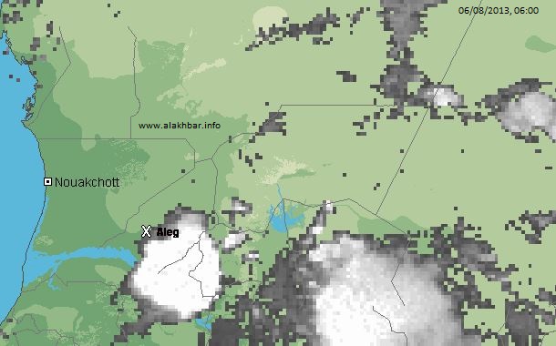 منذ الساعة الواحدة من فجر الأربعاء 17 يوليو الجاري تتواجد بعض العواصف الرعدية المحملة بالامطار المتوسطة إلى الكثيفة جدا على جل المنطقة الممتدة من النصف الجنوبي من الحوض الشرقي وحتى اترارزة غربا ويتوقع أن تؤدي إلى تهاطل الأمطار المتوسطة إلى الغزيرة جدا طيلة هذا اليوم بإذن الله تعالى.