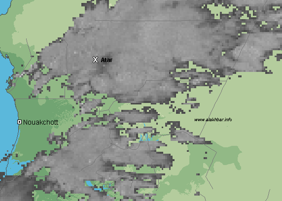 تشهد الآن أجواء ولايات الحوضين الشرقي والغربي، لبراكنة، آدرار، تيرس زمور، إينشيري وترارزة، تشهد وجود سحب محملة بالأمطار متوسطة إلى عالية الكثافة يتوقع أن تؤدي إلى هطول الأمطار طيلة مساء اليوم 20 من سبتمبر الجاري بإذن الله تعالى.