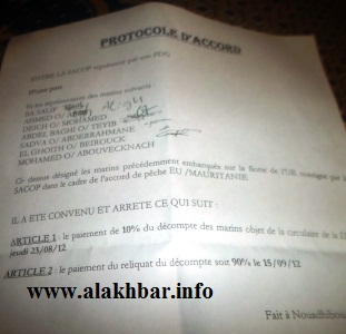 الأخبار(نواذيبو) - اتهمت مجموعة من البحارة العاملين فى شركة "ساكوب" المملوكة لرجل الأعمال الموريتانى محمد لمين ولد اشكير الشركة بما "المماطلة" فى صرف حقوقهم مؤكدين أنهم لم يحصلوا عليها رغم توقيع مدير الشركة على ذالك فى محضر مكتوب حسب قولهم .