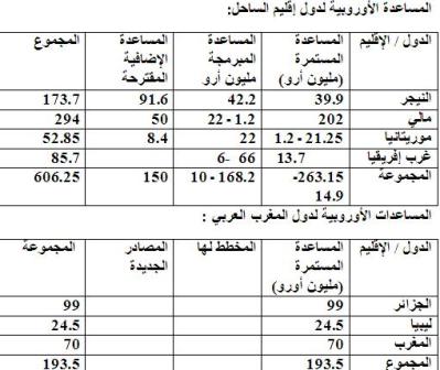 يوضح الجدول التالي حجم المساعدات الأوربية المقدمة إلى دول إقليم الساحل والمغرب العربي، عبر صندوق التنمية الأوروبي ، وجهاز تمويل الاستقرار، وسياسة الجوار الأوربي.