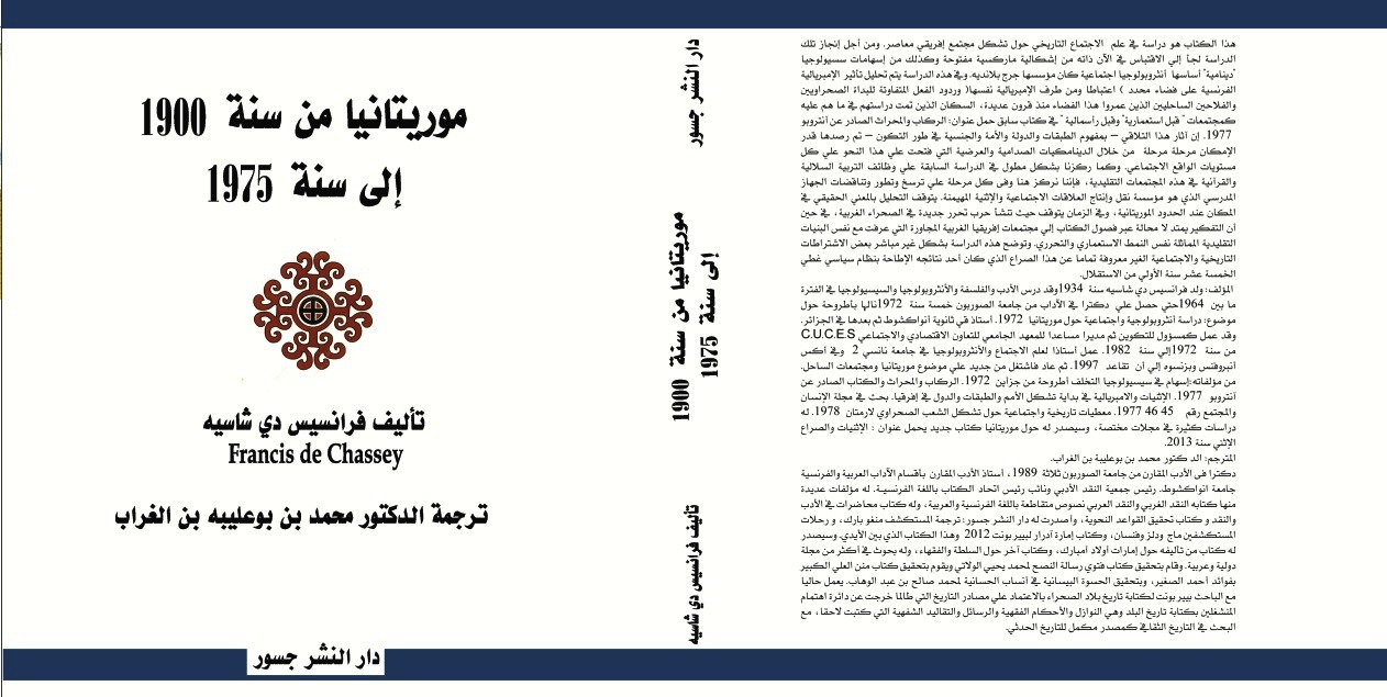 صدر عن دار النشر "جسور" كتاب "موريتانيا من سنة 1900 إلى سنة 1975" للباحث فرانسيس دي شاسه Francis de Chassey في نسخته العربية، بعد ترجمته من قبل الدكتور محمد بن بوعليبة بن الغراب.