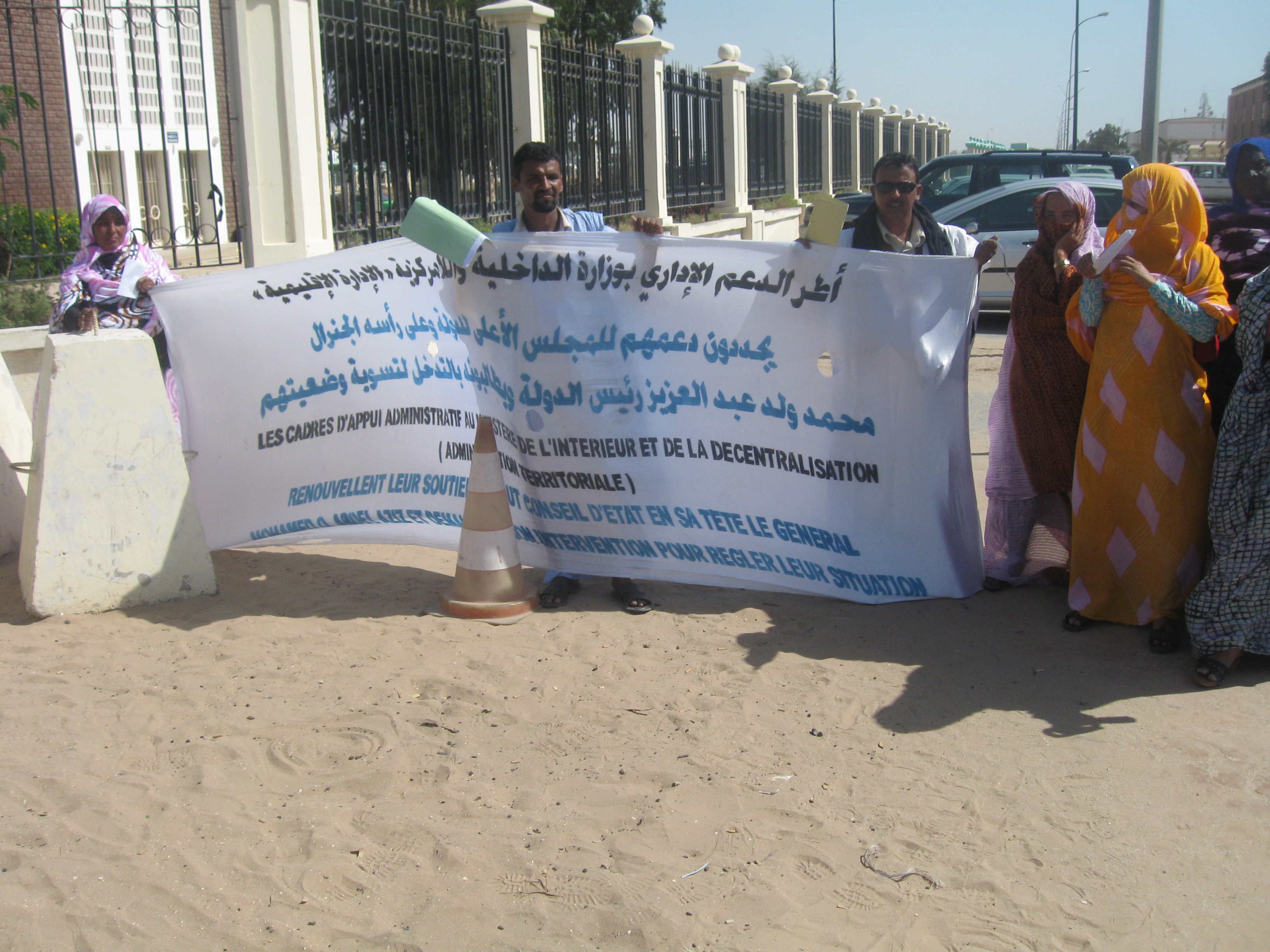 إنهم جيران القصر الجدد الذين قرروا أن يسمعوا قضاياهم لسكانها يقضون أيامهم أمام بوابات القصر "ينشرون " مآسيهم "يغدون خماصا ويروحون خماصا" فمنظر اللافتات التي يقف خلفها مجموعة من المواطنين يحتجون على أوضاعهم الاقتصادية والاجتماعية أمام القصر الرئاسي في نواكشوط أصبح أحد الطقوس المألوفة في حياة الموريتانيين.