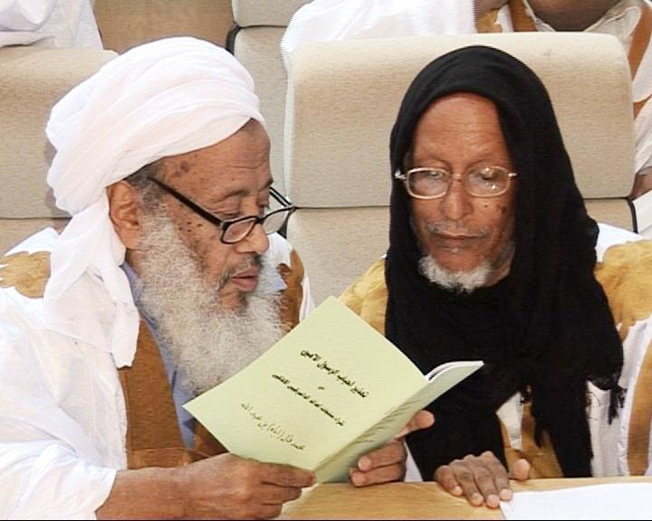 العلامة محمد سالم رحمه الله يستعرض كتابا للعلامة أباه ولد عبد الله حفظه الله الذي يظهر على يمن الصورة (تصوير الأخبار)
