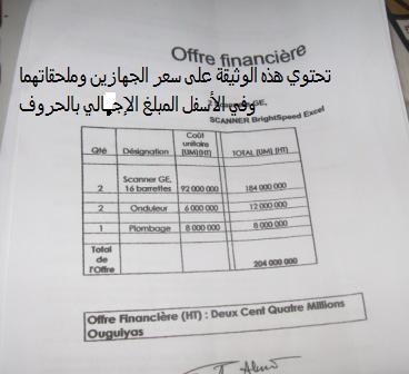 حصلت وكالة أنباء الأخبار المستقلة على بعض الوثائق المتعلقة بصفقة جهاز الكشف الباطني (اسكانير) الذي تم شراء اثنين منه لصالح المستشفى الوطني والمستشفى الجهوي بمدينة كيفة، عاصمة ولاية لعصابه، بأمر من رئيس المجلس الأعلى للدولة الجنرال محمد ولد عبد العزيز، وفازت بصفقته مؤسسة "العالمية للخدمات الطبية" ( S.M.MEDIC) التي يمتلكها أحد النواب البرلمانيين الموالين للمجلس الأعلى للدولة