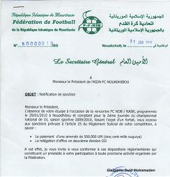 توصل القسم الرياضي بوكالة أنباء "الأخبار" المستقلة برسالة وجهها الأمين العام للاتحادية الوطنية لكرة القدم تحدد العقوبة التي قررتها الاتحادية ضد نادي "أف سي نواذيبو" بعد رفضه دخول أرضية الملعب الجهوي في نواذيبو وخوض المباراة المقررة أمام فريق "نصر السبخة"