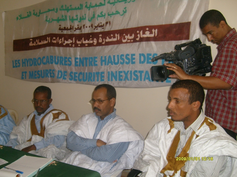 في إطار ندوتها الشهرية التي كانت تحت عنوان :الغاز بين الندرة وغياب إجراءات السلامة " استضافت الجمعية الموريتانية لحماية المستهلك ومحاربة الغلاء السبت 31/01/2009كلا من الحسن ولد أب المدير المساعد للمحروقات بوزارة النفط والسيد محمد محمود ولد احبيب المدير المساعد بإدارة حماية المستهلك بوزارة التجارة والسيد يوب ولد أبات من الاتحادية الموريتانية لتجار الغاز والمحامي أكليكم ولد محمد عبد الله ممثلا لجمعيات حماية المستهلك