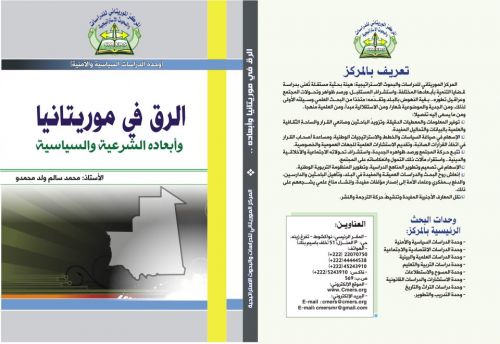 الأخبار (نواكشوط) - صدر عن المركز الموريتاني للدراسات والبحوث الأستراتيجية كتاب "الرق في موريتانيا وأبعاده الشرعية والسياسية"، لمؤلفه الأستاذ محمد سالم ولد محمدو، ويحوي الكتاب ثلاثة فصول وملاحق موزعة على 240 صفحة، تعالج أزمة الرق في موريتانيا من جوانب مختلفة.