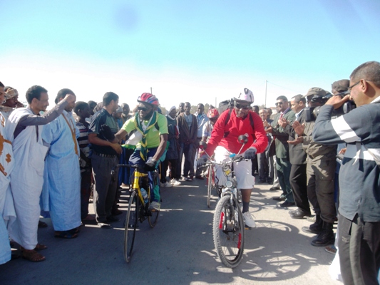 لحظة انطلاق الدراج الموريتانى برفقة زميله صوب العاصمة نواكشوط لقطع 470 كلم فى صحراء موحشة (تصوير الأخبار)