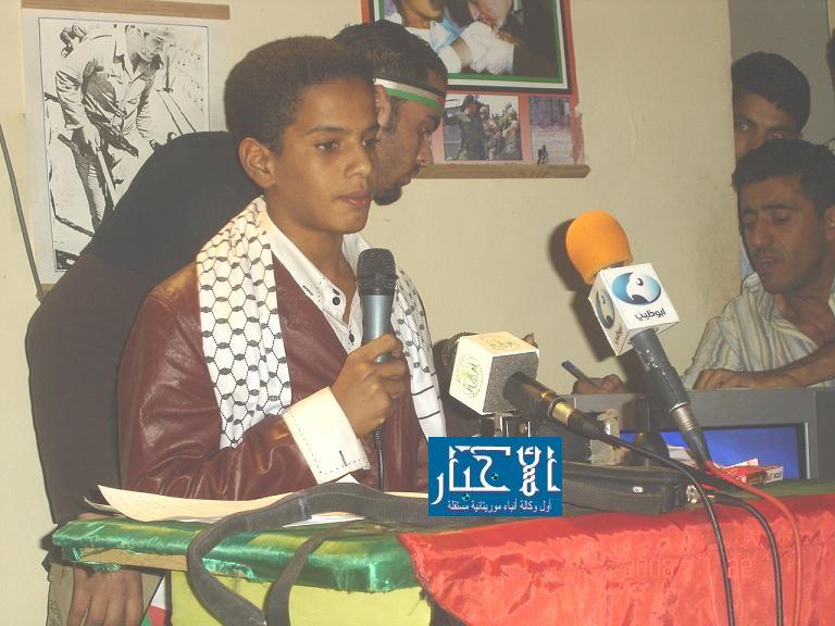 "صلاح الدين" .. نجل القيادى الإسلامى محمد جميل ولد منصور أمام المشاركين فى حفل السفارة وقد قرأ بيان أطفال موريتانيا تضامنا مع قطاع غزة